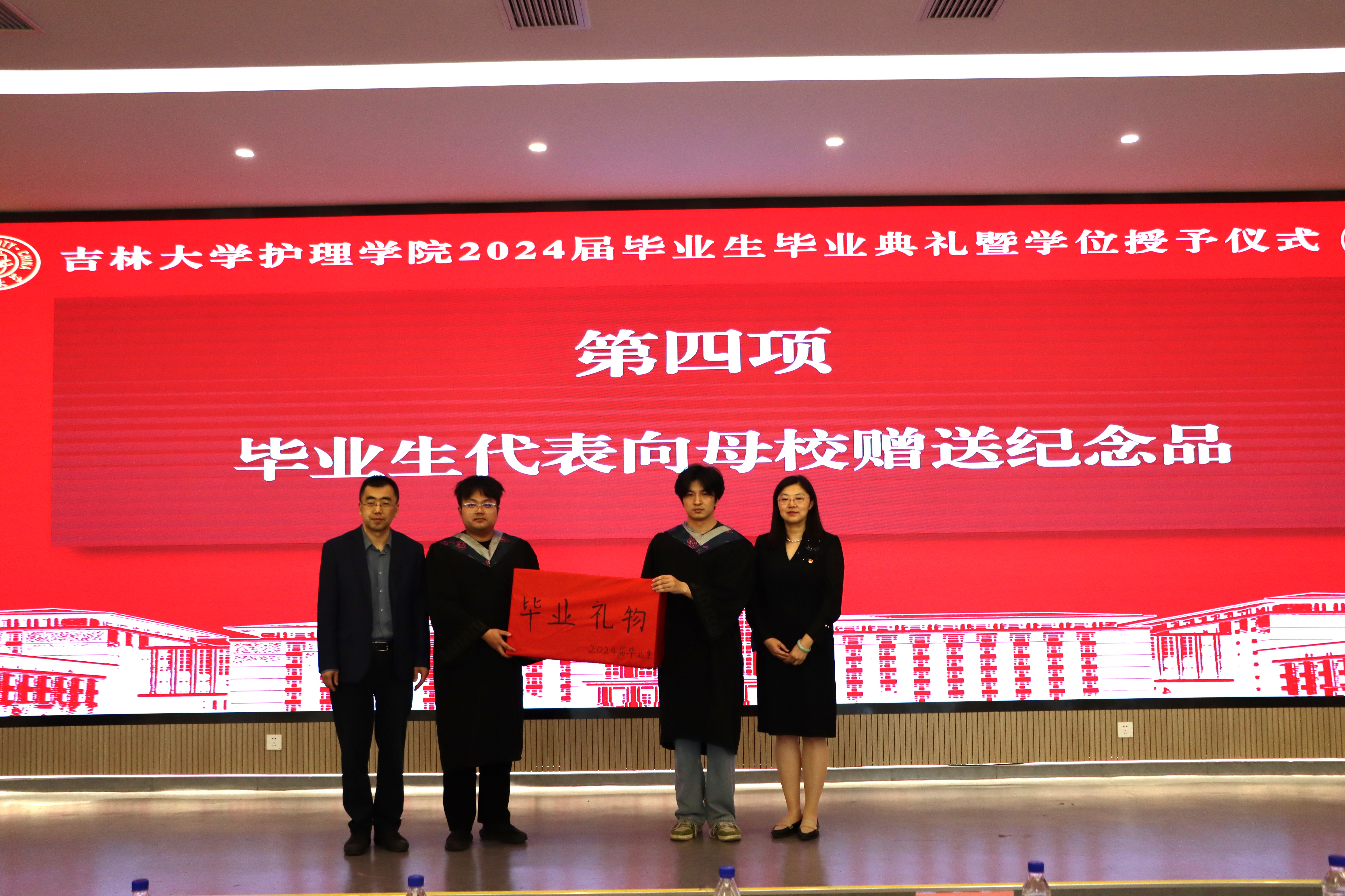 “优秀毕业生”称号的学生名单;党委书记韩月波为优秀毕业生们颁发荣誉证书。毕业生代表向母校赠送纪念品,表达对母校的不舍与祝福;学院为毕业生赠送定制的专属纪念礼物,留下美好回忆,送上美好期许。