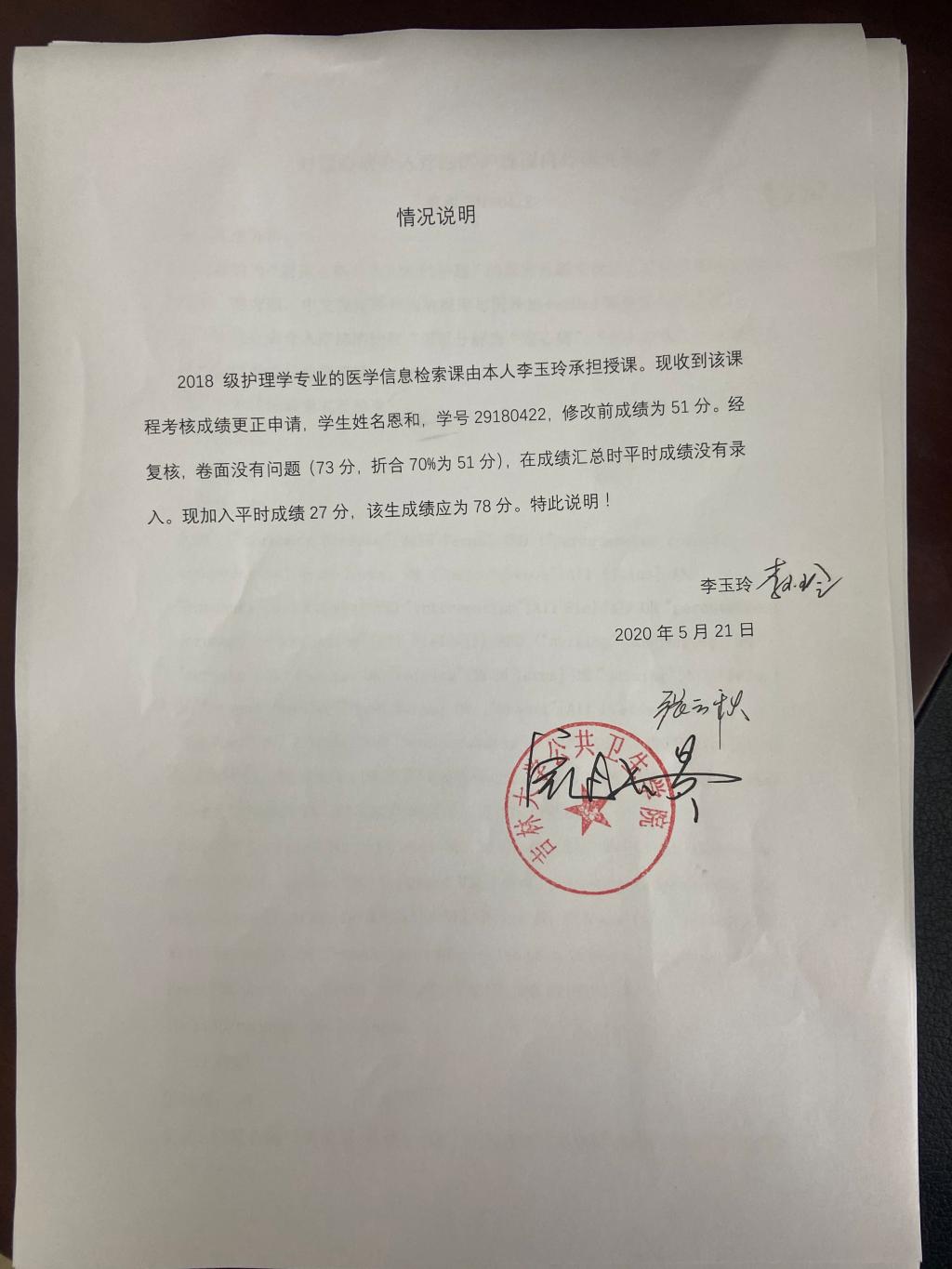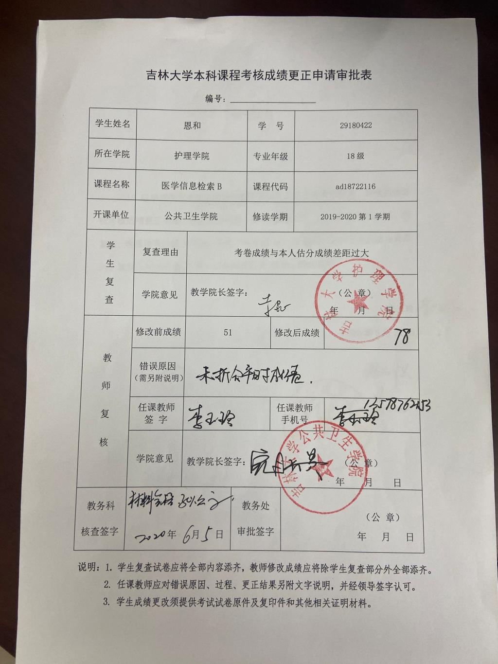 根据《关于进一步明确本科生课程考核等有关问题的通知》(校教字〔2018〕47号)文件有关精神,现对 taiav 2018级恩和同学(学号:29180422)2019-2020-1学期课程成绩更正如下: