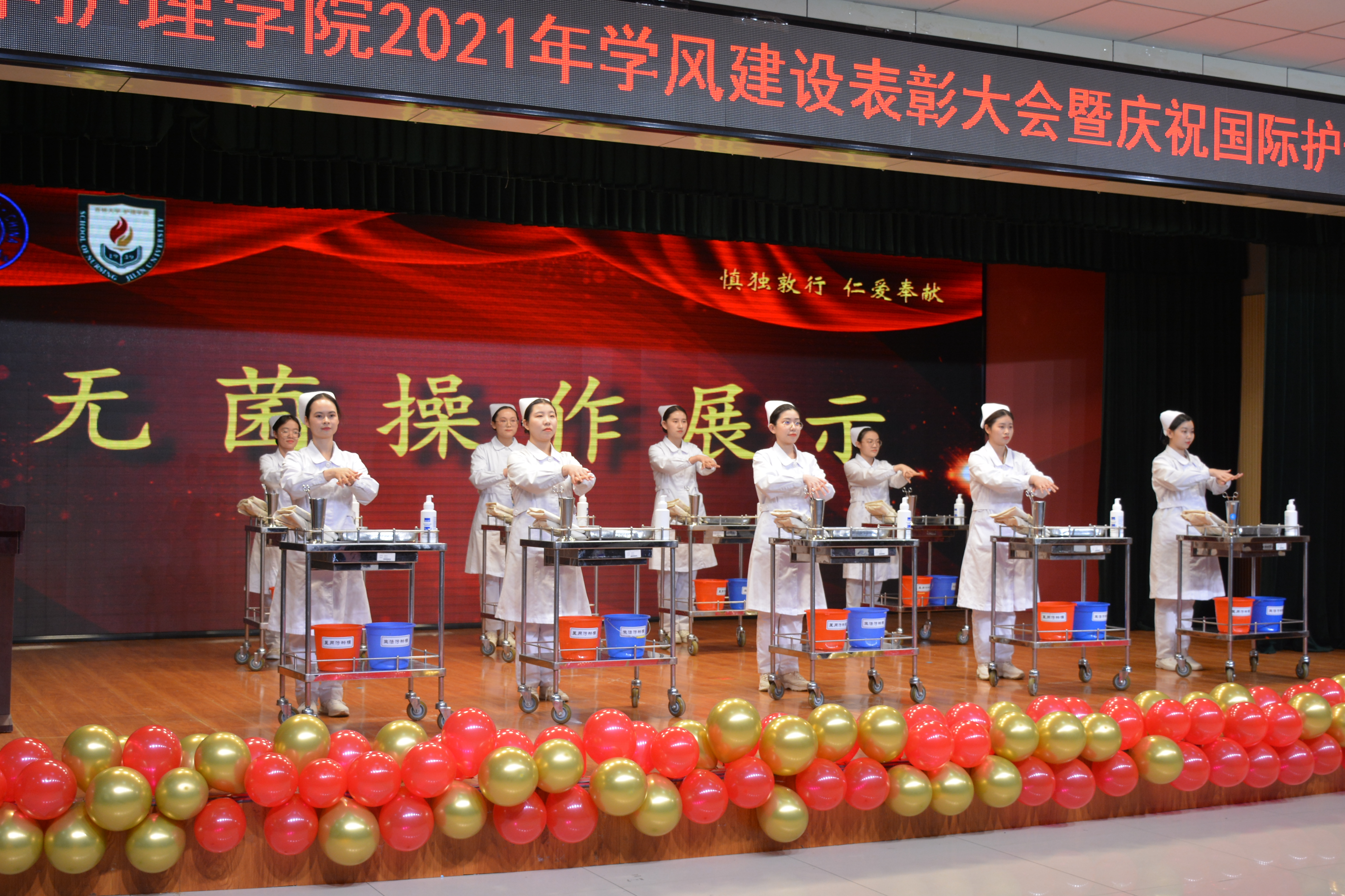 会上,李昆副院长宣读了表彰决定,参会领导分别为获得学习标兵、优秀班级、优秀寝室、优秀学术科研奖、优秀组织和志愿服务、综合技能大赛等奖项的优秀个人与集体颁奖。颁奖之后,学生献上了精湛的护理操作展示和优雅的护理礼仪展示。随后,学习标兵代表、2018级支圣泽同学向在场同学们分享了自己的学习经验,勉励同学们珍惜时光,努力学习。最后,陈立院长讲话,她介绍了学院过去一年取得的成绩,回顾了医护人员在抗击疫情中展现的责任担当和巨大贡献,对同学们提出了殷切希望和要求,希望大家铭记南丁格尔对护理事业发展的业绩和贡献,倡导和弘扬无私奉献、救死扶伤的人道主义精神,秉承“慎独、敦行、仁爱、奉献”的光荣传统,继承和发扬“白求恩精神”,树立良好的学风、院风,成为技术精良、品德高尚的优秀人才。