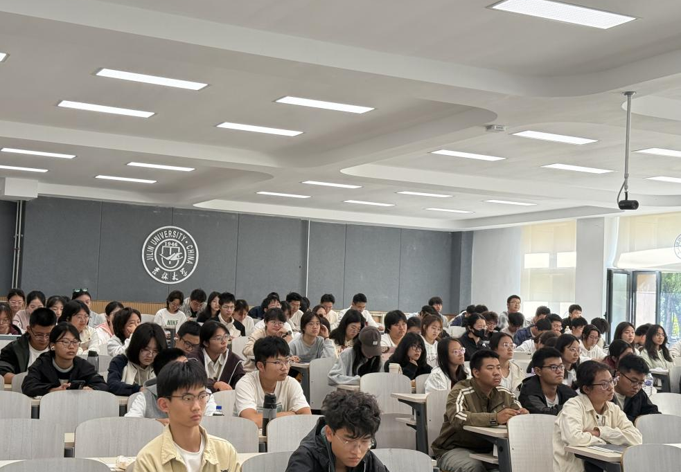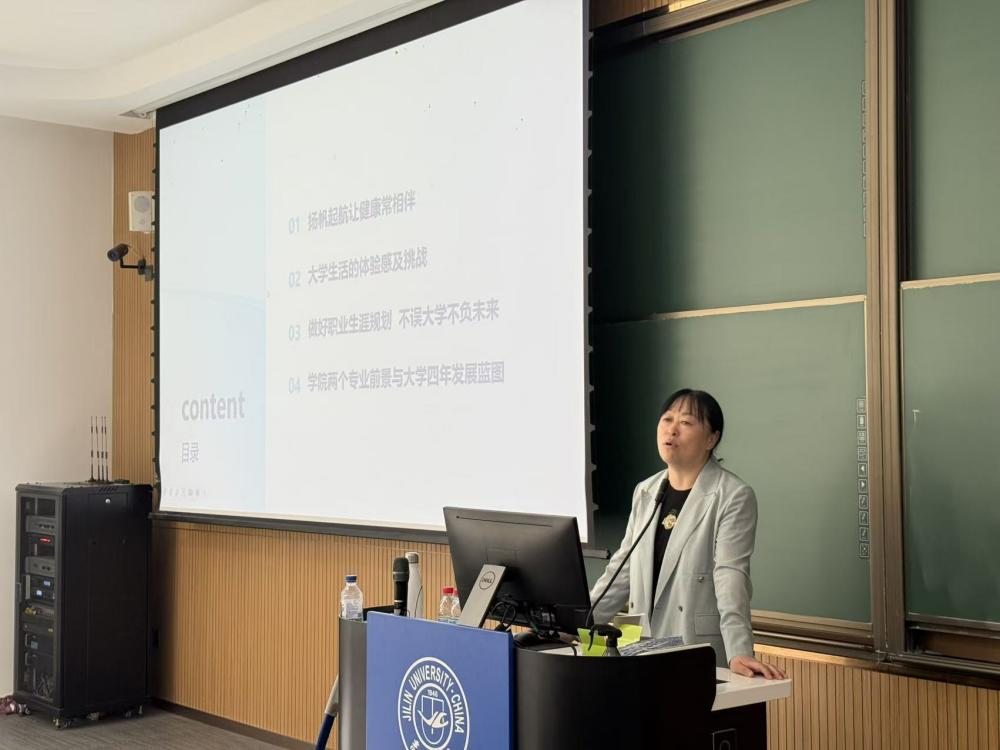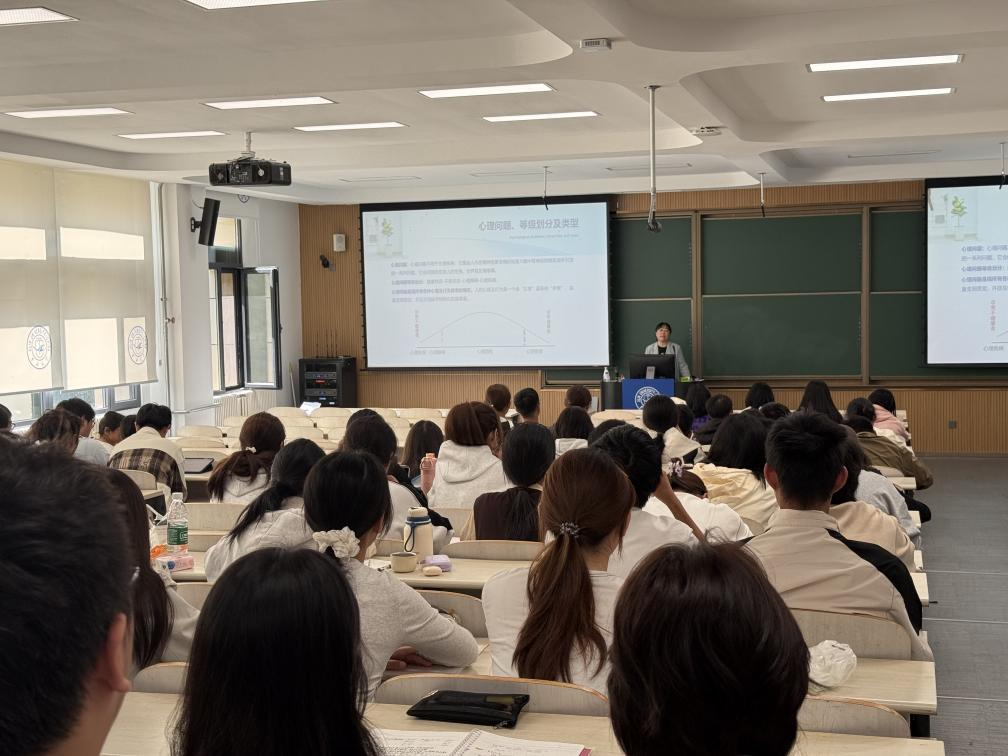 关工委驻会委员李亚琴教授讲授心理调适与职业生涯规划讲座,学院党委副书记兼副院长密佳音老师、2025级本科生辅导员朱晓玉老师及2025级全体学生参加。