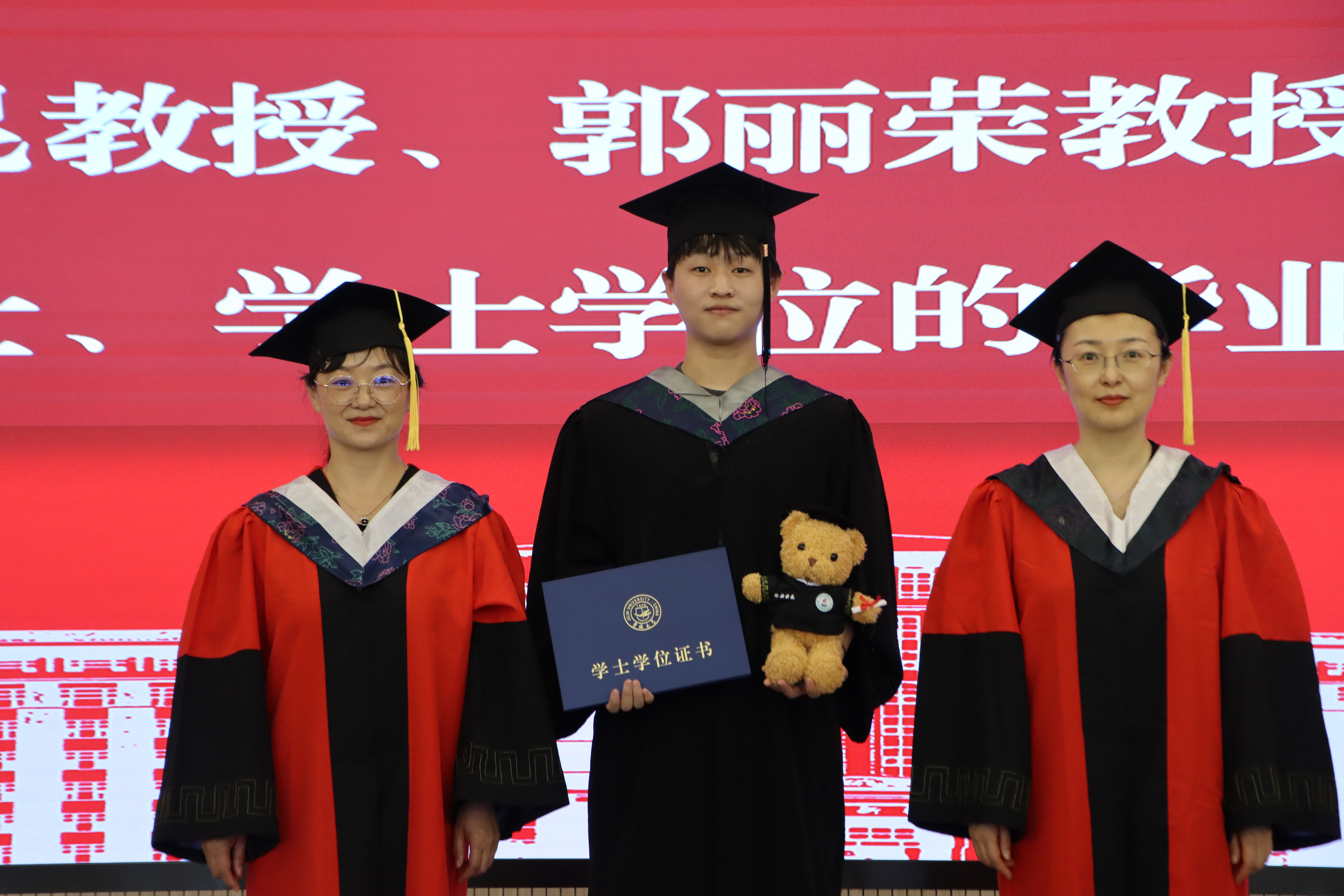 副院长、学位评定分委员主席李昆老师,学术委员会主任郭丽荣老师为获得博士学位、硕士学位、学士学位的毕业生拨动流苏、授予学位并颁发学位证书。