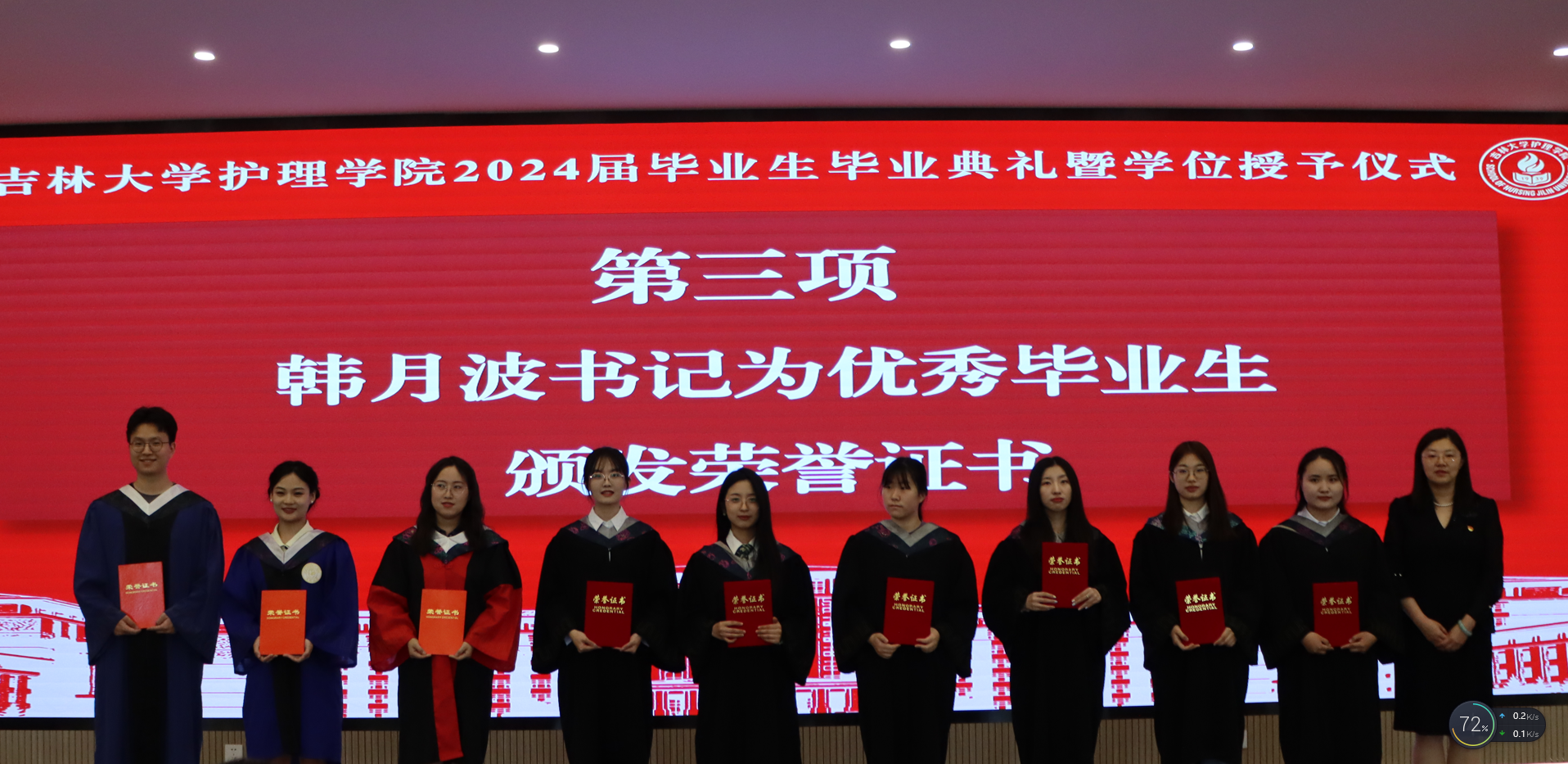 “优秀毕业生”称号的学生名单;党委书记韩月波为优秀毕业生们颁发荣誉证书。毕业生代表向母校赠送纪念品,表达对母校的不舍与祝福;学院为毕业生赠送定制的专属纪念礼物,留下美好回忆,送上美好期许。
