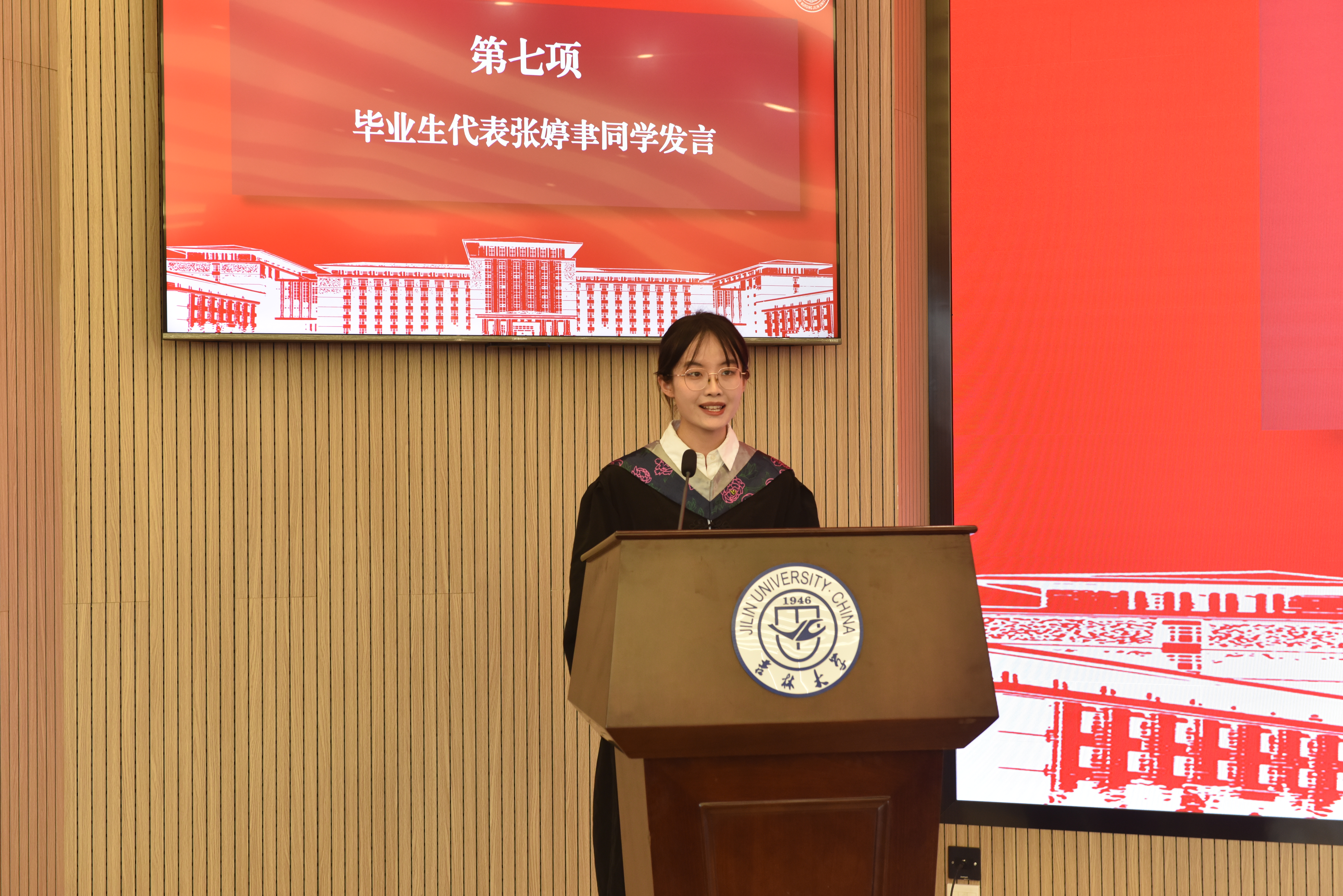 研究生毕业生代表马冬飞和本科毕业生代表张婷聿发言,深情回忆了学习生活的点点滴滴,深切表达了对学院、对老师的感恩之情和对同窗的不舍之意。教师代表李闺臣向全体毕业生送上了最诚挚的祝福,希望同学们永葆奋斗底色,勇敢地为自己的人格以及人生而奋斗,在拥抱未来的道路上追寻万丈光芒。